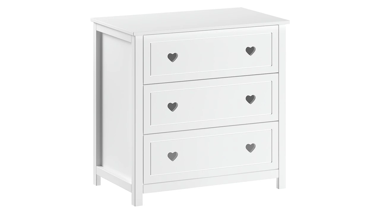 Breng een vleugje tijdloze elegantie en romantiek in de kinderkamer met de Amori commode. Dit prachtige meubelstuk uit de Amori-collectie is de perfecte mix van functionaliteit en stijl, gekenmerkt door de iconische hartjesuitsparingen die fungeren als verfijnde handgrepen.