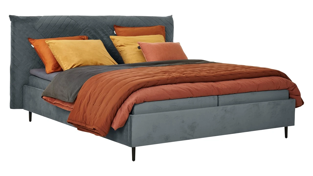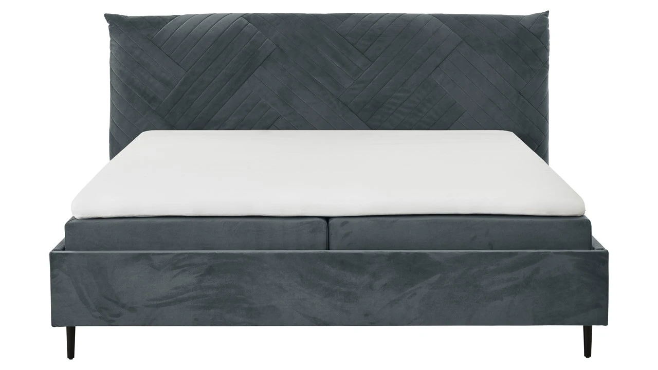 Het meest opvallende kenmerk van de Sapphire is het speelse hoofdbord met verticale stiknaden. Deze lijnen geven het bed een gelaagde, kussenachtige textuur die heerlijk comfortabel is om tegenaan te zitten. De rijke velours stof zorgt voor een luxueuze glans, terwijl de slanke, zwarte ‘Glamour’ pootjes het bed een moderne, zwevende uitstraling geven.
