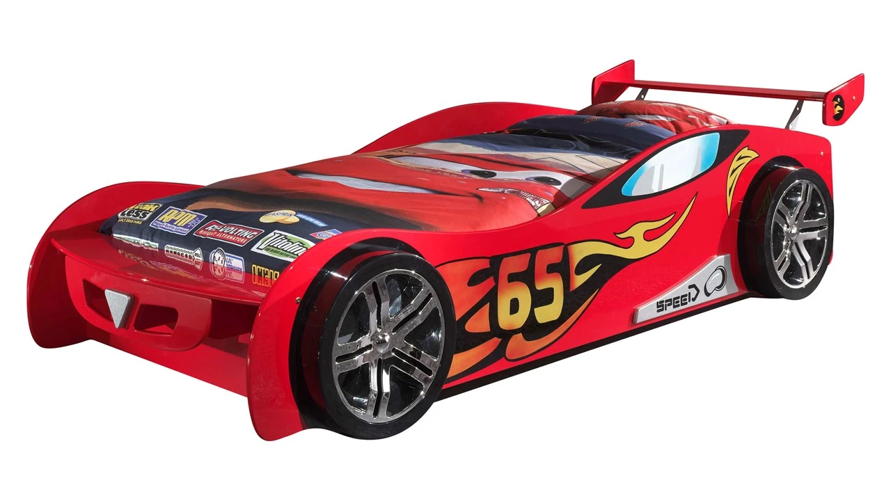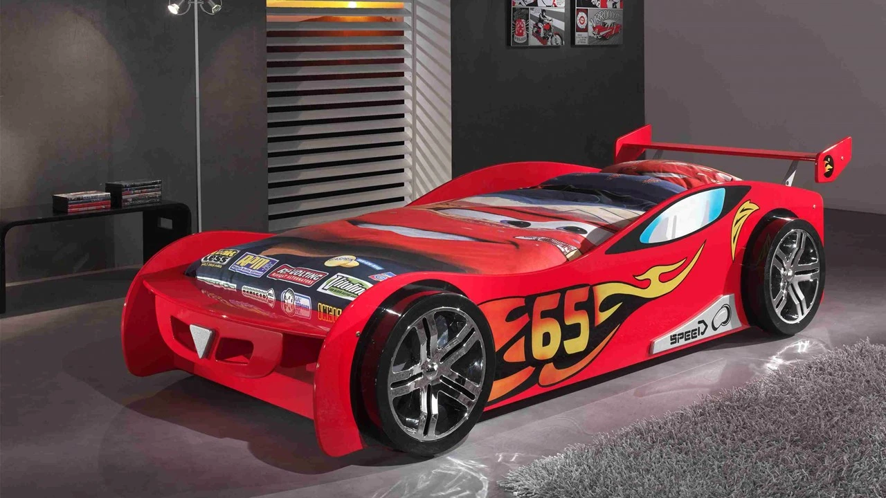 - Sportief Design: Een realistisch raceauto-ontwerp in glanzend rood MDF voor een dynamische sfeer in de kinderkamer.