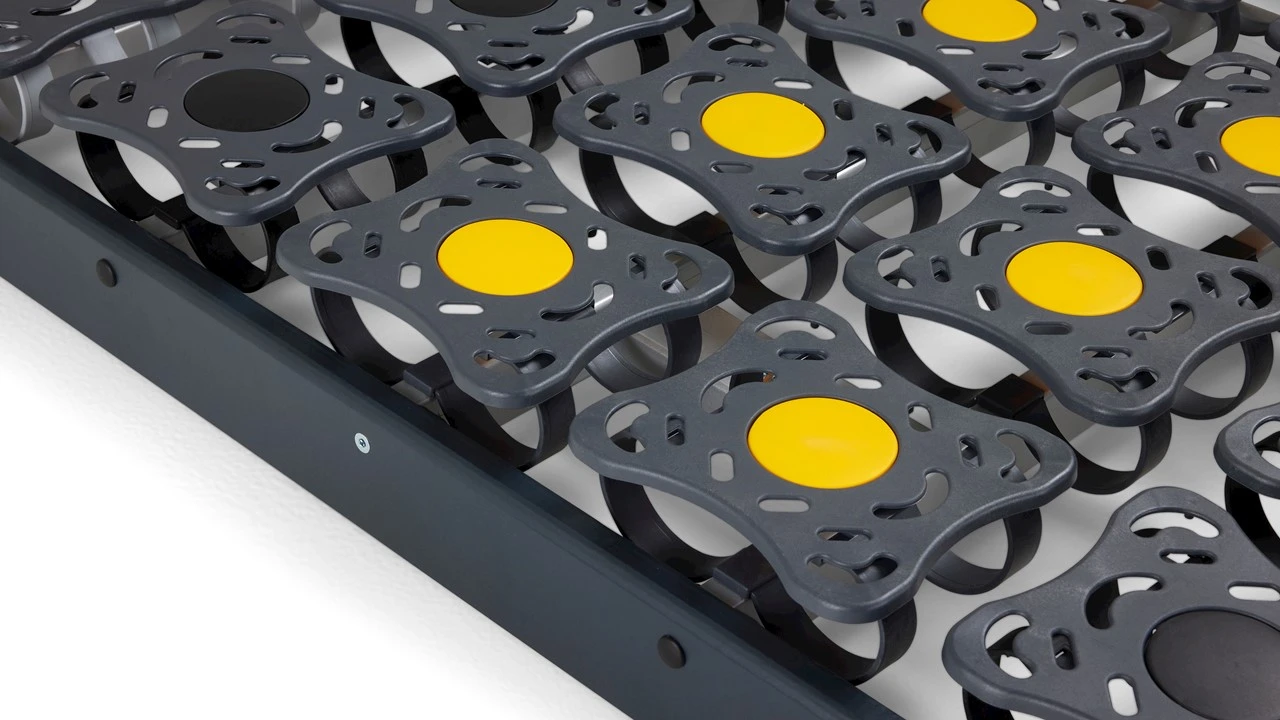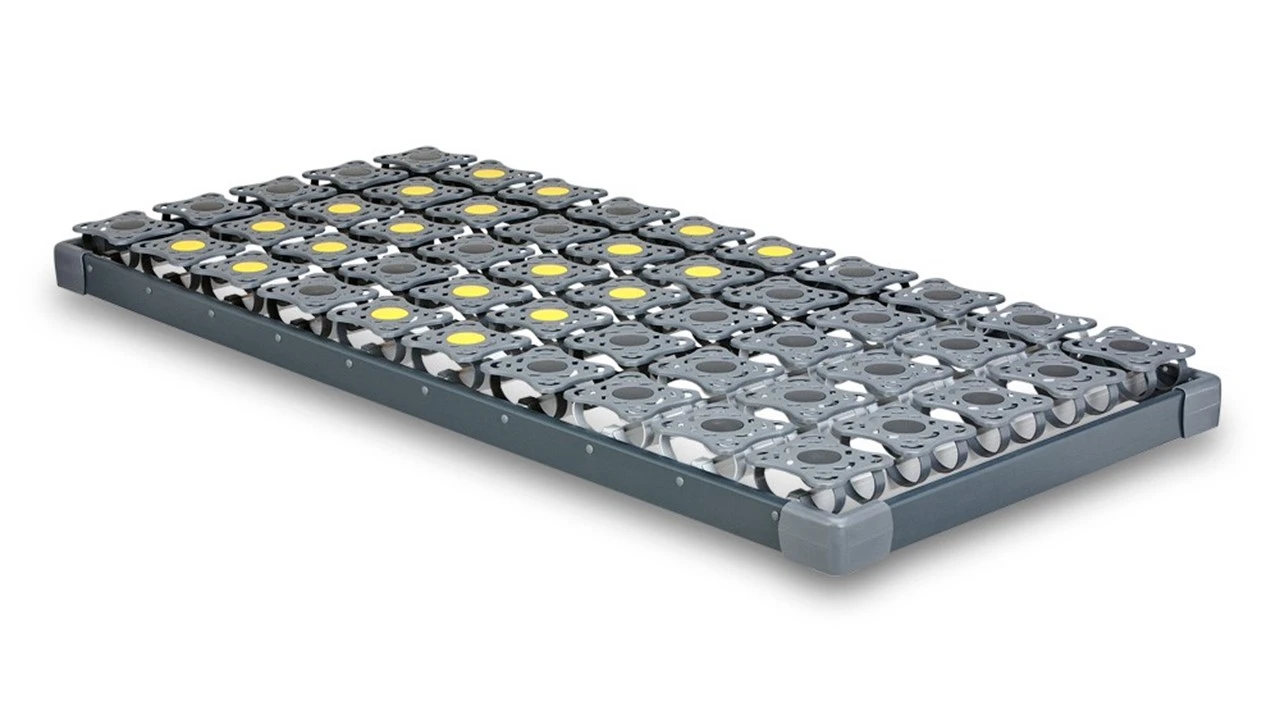 De bodem valt direct op door de innovatieve, flexibele schotels uitgevoerd in een contrasterend grijs en wit kleurpalet. Deze schotels bewegen onafhankelijk van elkaar, waardoor de druk van je lichaam nauwkeurig wordt opgevangen. De witte schotels markeren de speciale comfortzones ter hoogte van de schouders en heupen voor een ergonomische zinking, terwijl de grijze schotels zorgen voor een stabiele basis.