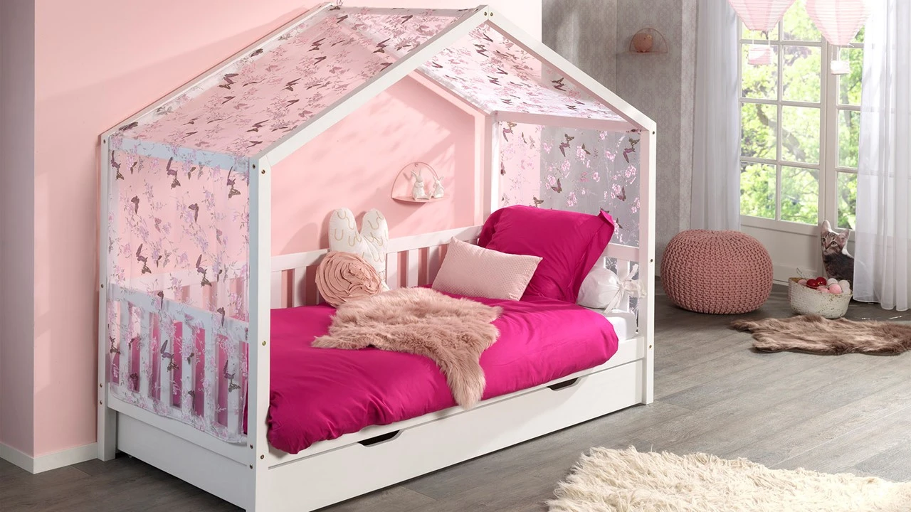 Deze set kenmerkt zich door een zachte roze basis verfraaid met een charmant wit vlindermotief. De stof valt soepel langs het frame van het huisbed en kan eenvoudig worden vastgeknoopt voor een open look of gesloten voor een knusse hut-ervaring.