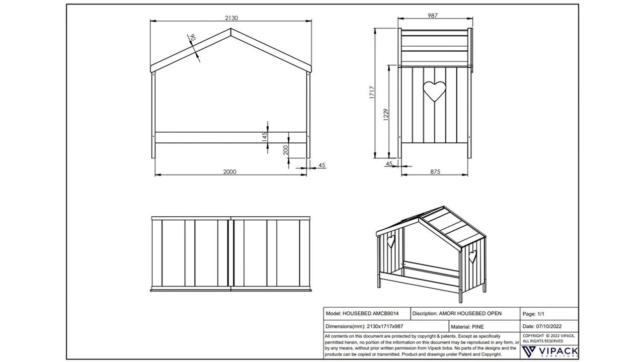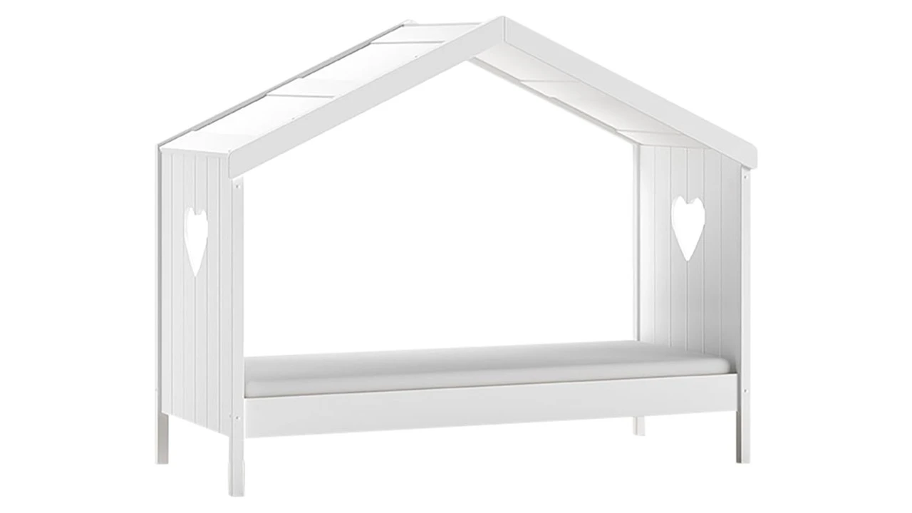 Het bed is uitgevoerd in een zijdezachte witte finish en onderscheidt zich door de iconische hartjes-uitsparingen in zowel het hoofd- als het voeteinde. Het strakke frame van het huisje biedt de mogelijkheid om decoraties zoals lichtsnoeren of sluiers toe te voegen voor een persoonlijke touch.
