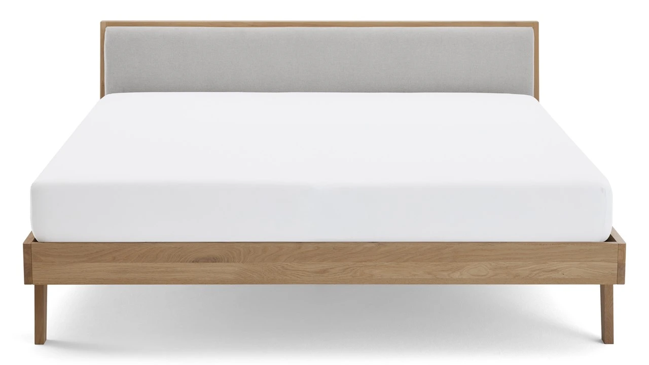 Het Skogar bed valt op door zijn minimalistische lijnen en het eigentijdse lage model. De zacht afgeronde hoeken van het massief eiken frame stralen vakmanschap uit. Het hoofdbord is bekleed met een hoogwaardige stof (keuze uit micro-chenille of melange), wat zorgt voor een volumineuze en luxueuze uitstraling die uitnodigt tot ontspanning.