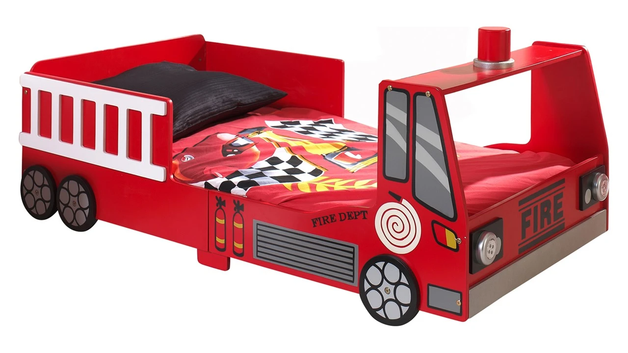 Het bed is tot in detail vormgegeven als een echte brandweerwagen, compleet met decoratieve wielen en ladders aan de zijkant. De ingebouwde LED-verlichting aan de voorzijde fungeert als stoere koplampen, wat niet alleen een unieke sfeer creëert maar ook een veilig gevoel geeft in het donker.