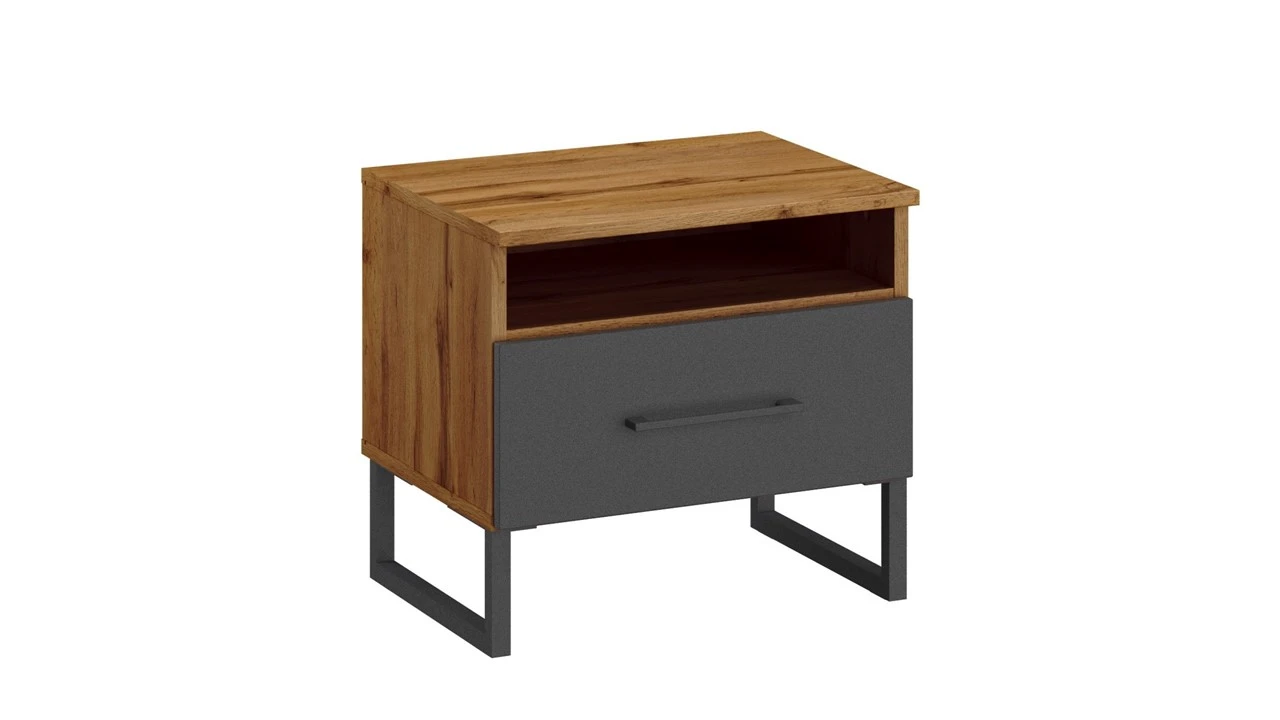 Breng karakter in je slaapruimte met de Nachtkast Oakham. Dit meubelstuk combineert een warme eiken look met de rauwe, industriële elementen van zwart metaal, waardoor het de ideale metgezel is voor een modern interieur.
