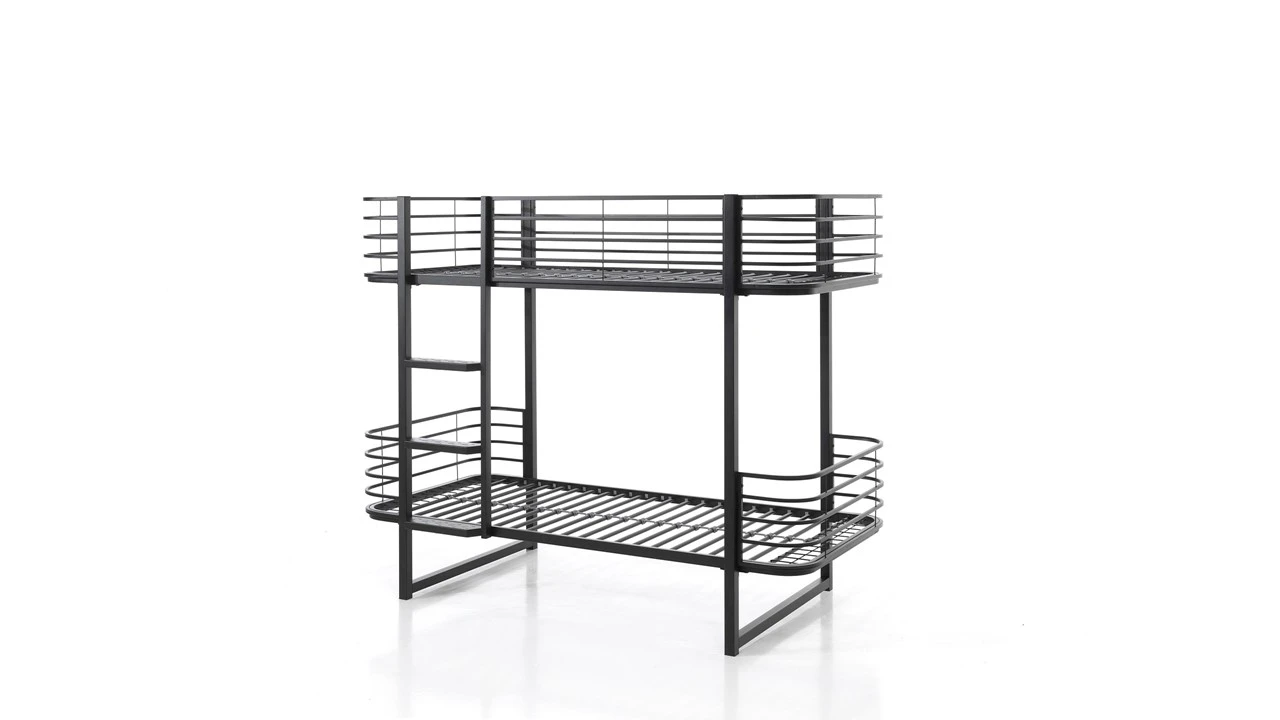 Het Stapelbed Oscar onderscheidt zich door zijn strakke, minimalistische lijnen en het robuuste metalen frame. Het unieke ontwerp creëert een zwevend effect, waardoor de kamer groter oogt. De metallic afwerking en de stevige constructie zorgen voor een moderne uitstraling die perfect past in een industriële of futuristische kinderkamer.