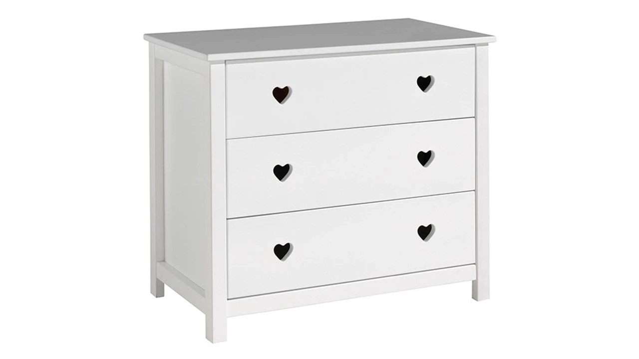 Deze commode valt op door de heldere witte afwerking en de subtiele hartvormige uitsparingen die dienst doen als handgrepen. Het romantische design van de Amori-serie brengt een zachte, tijdloze uitstraling naar de babykamer.
