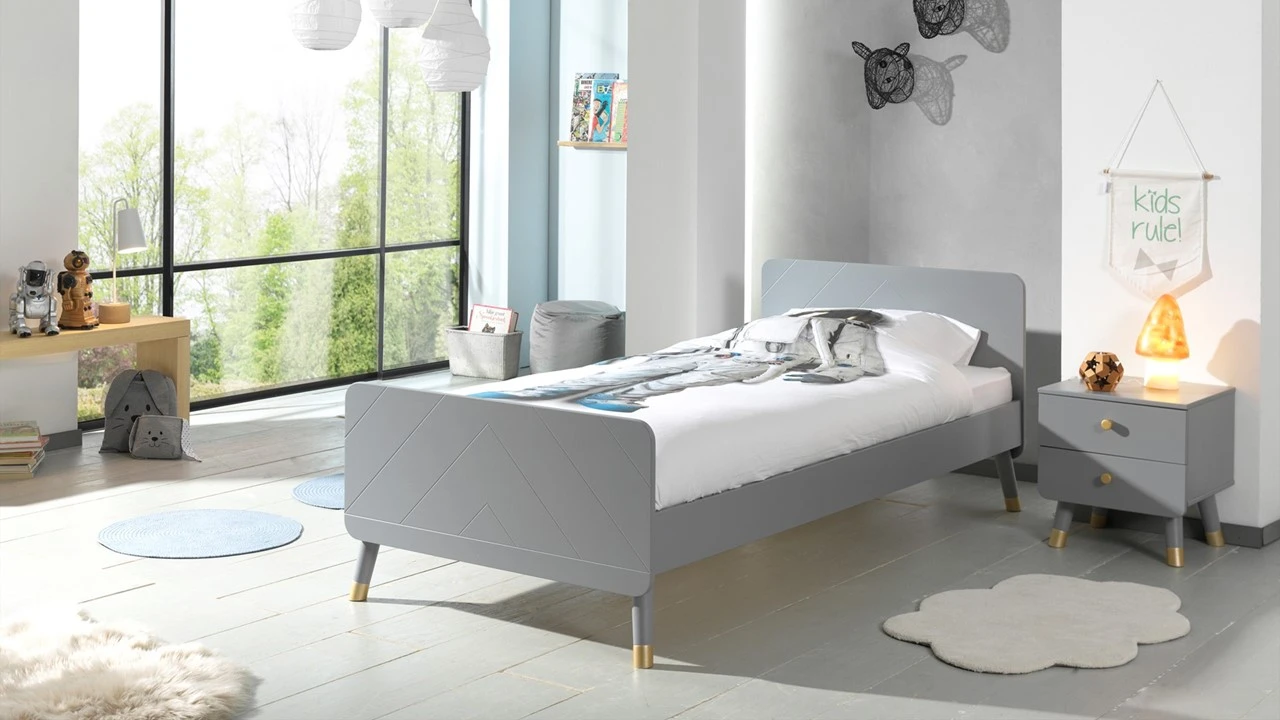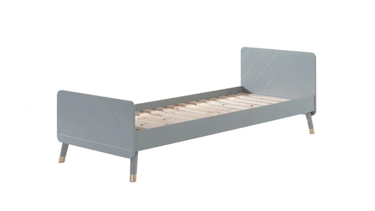 Wat Bed Billy echt bijzonder maakt, zijn de subtiele maar krachtige visuele details. Het hoofd- en voetbord zijn voorzien van een prachtig gekerfd patroon van driehoekige strepen, wat zorgt voor textuur en karakter. De slanke poten zijn de kers op de taart, afgewerkt met chique gouden uiteinden die perfect contrasteren met de frisse kleur van het frame.