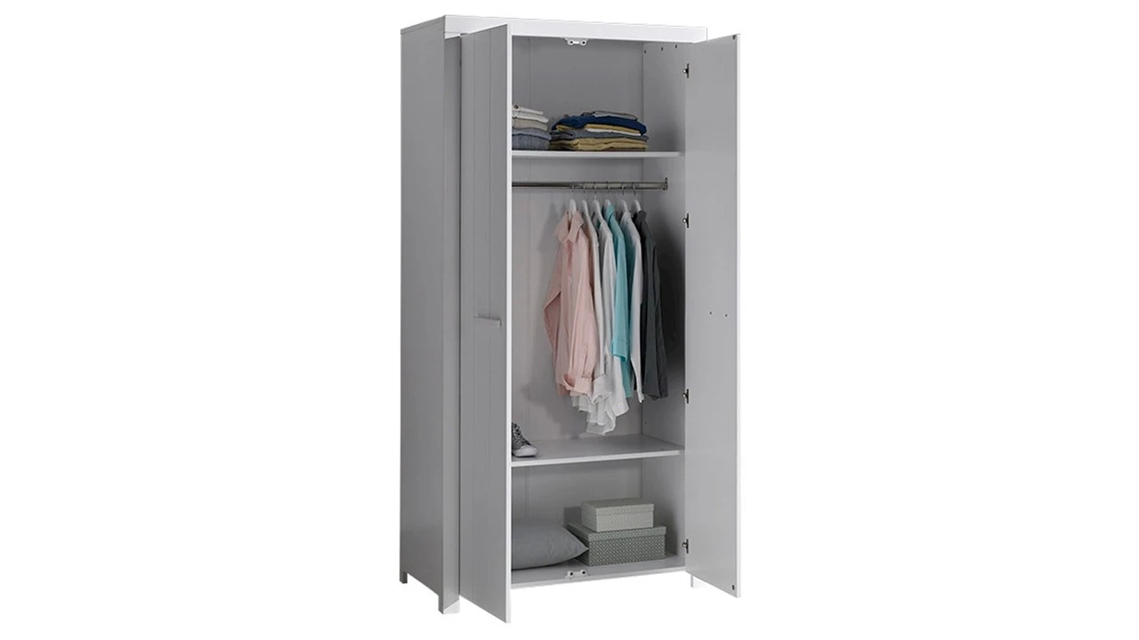 Deze kast is uitgevoerd in een helder wit design dat moeiteloos combineert met diverse interieurstijlen. Achter de twee stevige draaideuren bevindt zich een praktisch ingedeeld interieur met twee ruime legplanken en een metalen kledingroede voor hangkleding. De verticale lijnen en het strakke beslag geven de kast een moderne, Scandinavische uitstraling.