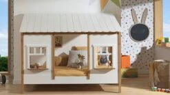 Het bed valt direct op door de strakke witte zijpanelen die prachtig contrasteren met de karakteristieke houten poten en ladderaccenten van massief grenen. Deze combinatie zorgt voor een luchtige Scandinavische sfeer. Dankzij het tijdloze ontwerp oogt het bed niet kinderachtig, waardoor het moeiteloos jarenlang meegaat van basisschool tot tienerjaren.